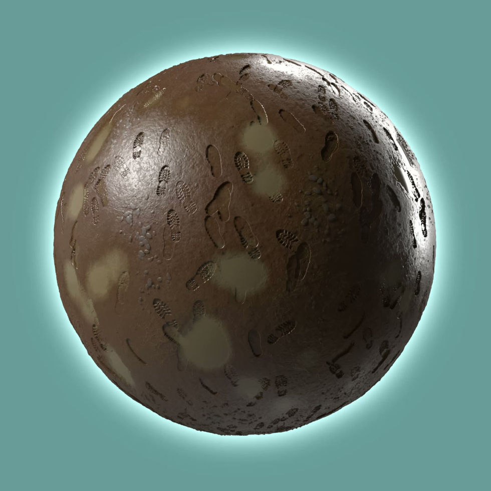 Muddy 3D material for battlefield terrain, procedurally generated using a Substance Designer node system.